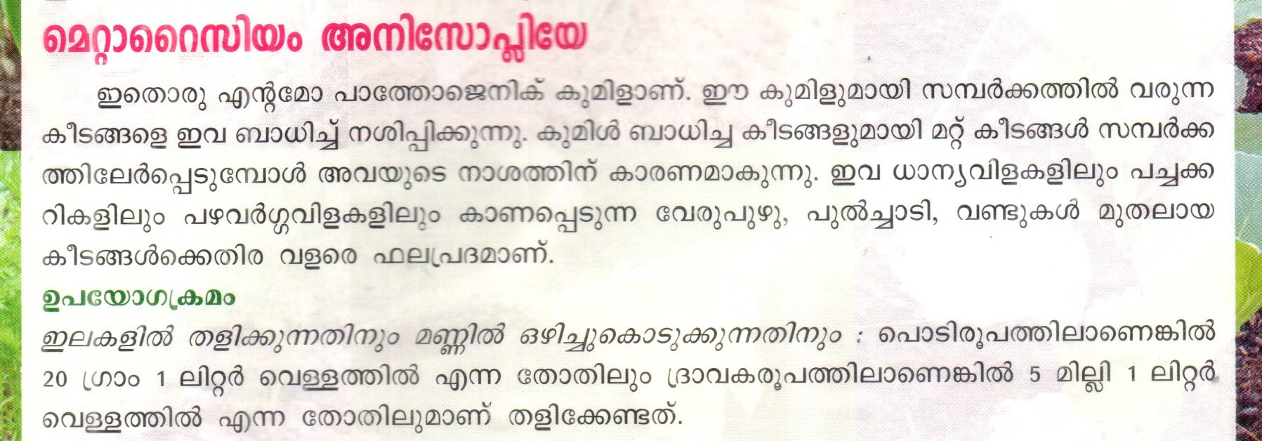ഫംഗസ് അധിഷ്ഠിത ജൈവ കീടനാശിനിയാണ് മെറ്ററിസിയം എനിസോപ്ലി. ഇത് 1-15% WP, 1-5% WP ഫോർമുലേഷനിൽ ലഭ്യമാണ്, ഇത് കായ് തുരപ്പൻ, ഇലകളുടെ ഫോൾഡർ, ഇല തിന്നുന്ന പ്രാണികൾ, മുലകുടിക്കുന്ന കീടങ്ങൾ, മണ്ണ് ചിതൽ, വെള്ള ഗൈഡാർ തുടങ്ങിയവയെ നിയന്ത്രിക്കുന്നതിന് ഉപയോഗപ്രദമാണെന്ന് കണ്ടെത്തി. ഈർപ്പവും ഉയർന്ന താപനിലയും. രാസ കുമിൾനാശിനികൾ ഉപയോഗിച്ചതിന് 15 ദിവസത്തിന് മുമ്പും മെറ്ററിസിയം എനിസോപ്ലി ഉപയോഗിച്ചതിന് ശേഷവും ഒരിക്കലും ഉപയോഗിക്കരുത്. അതിൻ്റെ സ്വയം ജീവിതം 1 വർഷമാണ്.