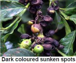 ഇലകളിൽ വൃത്താകൃതിയിൽ നിന്ന് 2-3 മീറ്റർ വ്യാസമുള്ള ചാരനിറത്തിലുള്ള പാടുകൾ. സരസഫലങ്ങളിൽ ചെറിയ ഇരുണ്ട നിറമുള്ള മുങ്ങിപ്പോയി പാടുകൾ കൃഷി ചെയ്യുന്നു. ബീൻസ് തവിട്ടുനിറമാകും. ഡൈ ബാക്കും സംഭവിക്കുന്നു. വ്യാപനത്തിൻ്റെയും അതിജീവനത്തിൻ്റെയും രീതി പുറംതൊലിയുടെ പുറം പാളിയിലെ ചത്ത ടിഷ്യൂകളിൽ സാപ്രോഫൈറ്റായി