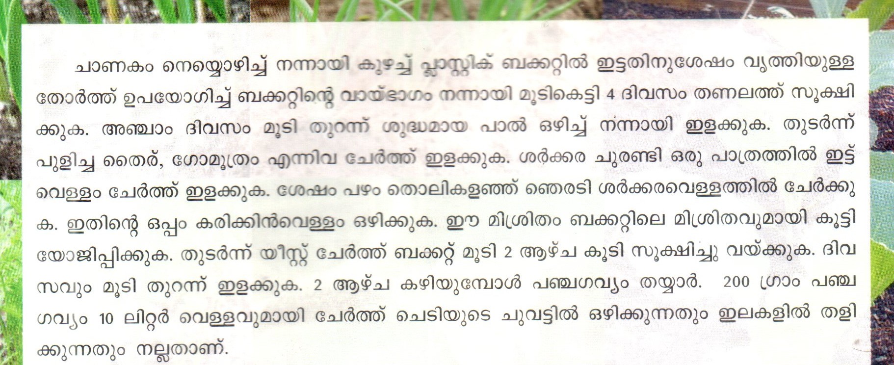 മണ്ണ് പ്രയോഗം: ഒരു ലിറ്റർ വെള്ളത്തിന് 30 മില്ലി എന്ന തോതിൽ പഞ്ചഗവ്യം ഉപയോഗിച്ച് റൂട്ട് സോൺ നനയ്ക്കുക.